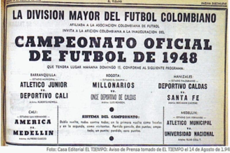 Un día como hoy hace 74 años iniciaba el Fútbol profesional en Colombia. El primer juego fue en Itagui alli jugaron Atlético Municipal que venció 2-0 a Universidad de Bogotá, Rafael Serna, abuelo del ‘Chicho’ Serna, marcó el primer gol, del rentado profesional, fue de penal.
